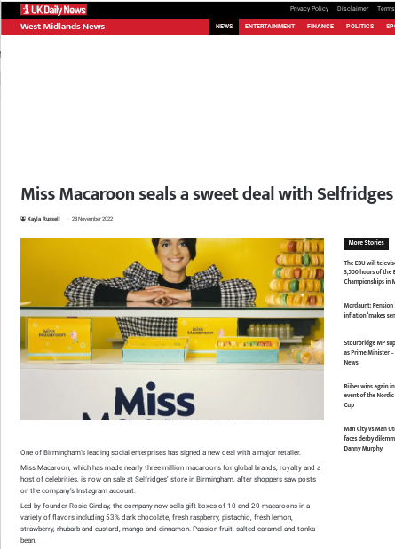 Miss Macaroon, which has made nearly three million macaroons for global brands, royalty and a host of celebrities, is now on sale at Selfridges’ store in Birmingham, after shoppers saw posts on the company’s Instagram account.