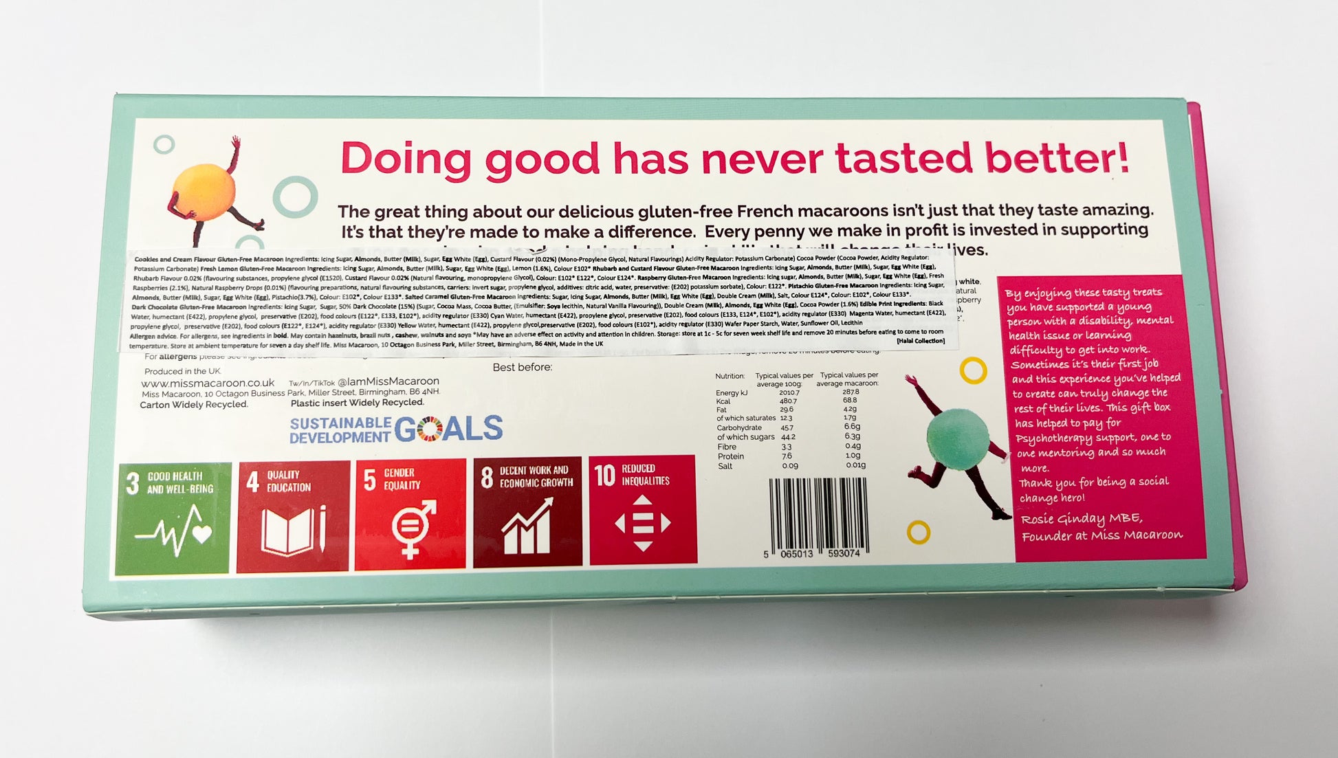 Produced in the UK. Miss Macaroon. 10 Octagon Business Park, Miller Street, Birmingham, B6 4NH.