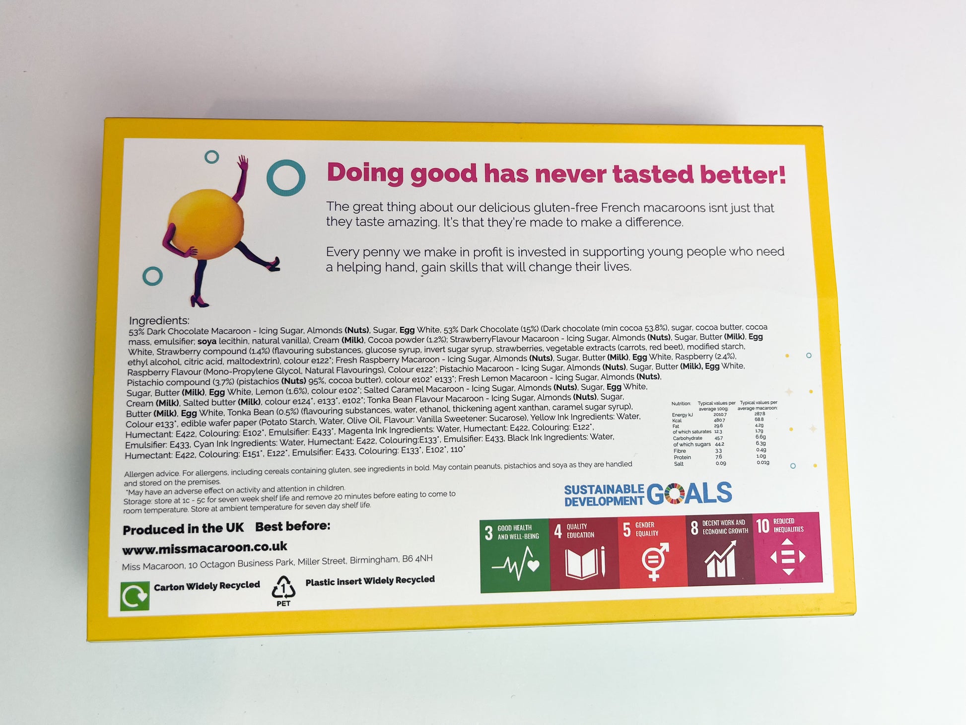 Produced in the UK. Miss Macaroon. 10 Octagon Business Park, Miller Street, Birmingham, B6 4NH.