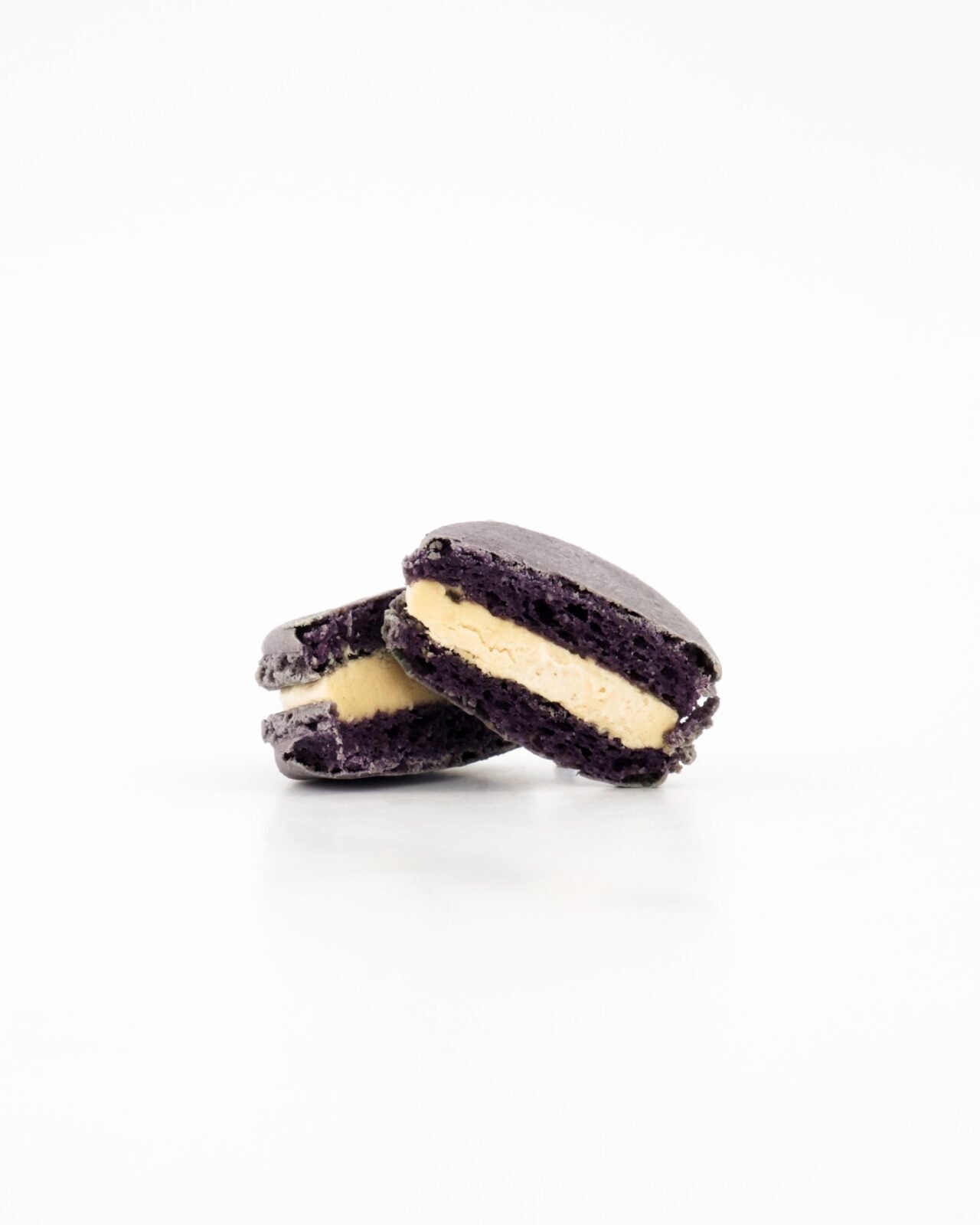 Violet Flavour Gluten-Free Macaroon Ingredients: Icing Sugar, Almonds, Butter (Milk), Sugar, Egg White (Egg), Violet Flavour (0.02%) (Flavouring preparations, flavouring substances, propylene glycol (E1520)), Colour E122*, E132*